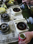 弊社では中型と大型の2種類のインデクスロータリーテーブルを取り扱っています。これらも海外の製品なのですが、全体の品質、操作性、割り出し方式などを、他の海外メーカーの類似品と比較検討した上で、これら2種類を最終的に弊社の品揃えに加えました。弊社では、ロータリー(円)テーブルにチャックアダプターが装着出来るように、独自の改造を加えています。ロータリ―テーブルを改造するためには、テーブル部分を機械加工するため、インデクス本体より取り外す必要があります。必然的に分解作業が発生するため、同時に各部の調整作業も実施します。元々の品質は比較的良好なのですが、やはり全体の動きにやや難があるものが多く、このような分解調整により品質の向上に努めています。また、塗装も雑な部分があり、細かい塗装の修正も欠かせません。機械本体並みの手間をかけてお届けする中型・大型インデクスロータリーテーブルは弊社自慢の逸品です。