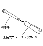 直装式コレットチャックMT3は棒状の品物の精密旋盤作業を行うためのものです。把握する品物と同じサイズのものが必要です。(4、6、8、10、12、16、18、20mm)