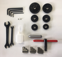 固定センターMT2、チェンジギアセット(ねじ切用)、三爪スクロールチャック用ハンドル・逆爪(3個1組)、工具類(ロットにより多少異なる場合があります)